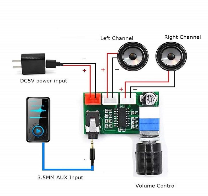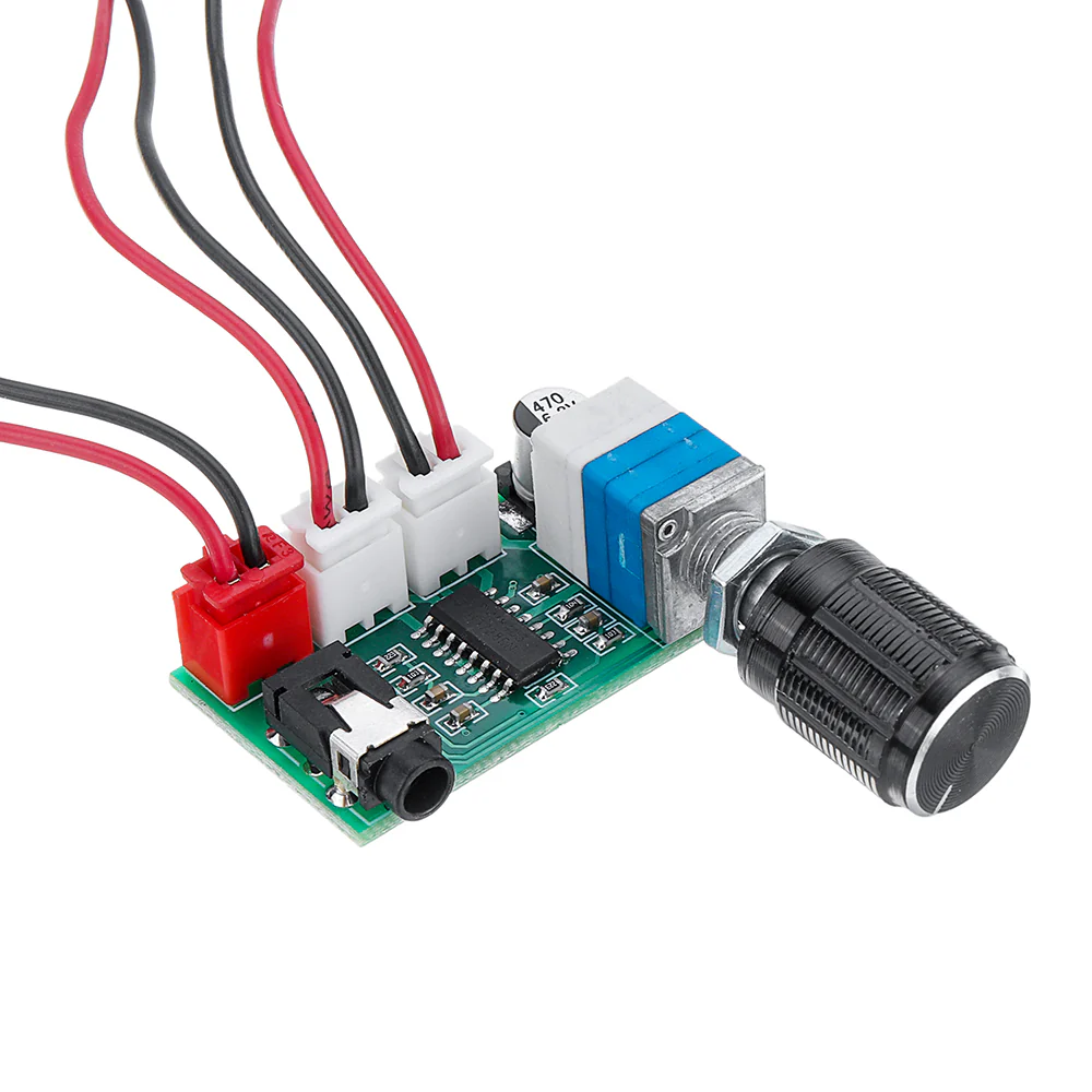 Onboard Volume Control Knob: Convenient rotary potentiometer to adjust volume easily.High-Efficiency Class-D Amplifier: Up to 90% efficiency, low heat generation, and minimal power loss.Compact PCB Design: Space-saving size, ideal for embedded or portable applications.Overheat and Short Circuit Protection: Ensures reliable and safe performance.