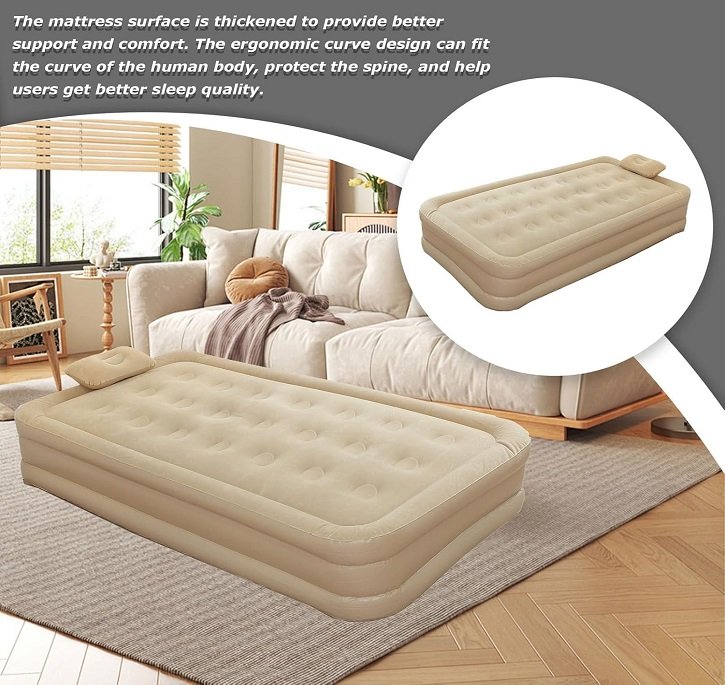 This Inflatable Bed for Home, designed for guests, everyday use, or temporary sleeping arrangements. Featuring a built-in electric pump, it inflates and deflates within minutes, saving you time and effort. Its durable, flocked top surface offers a soft, mattress-like feel, while the reinforced structure ensures stability and support throughout the night.